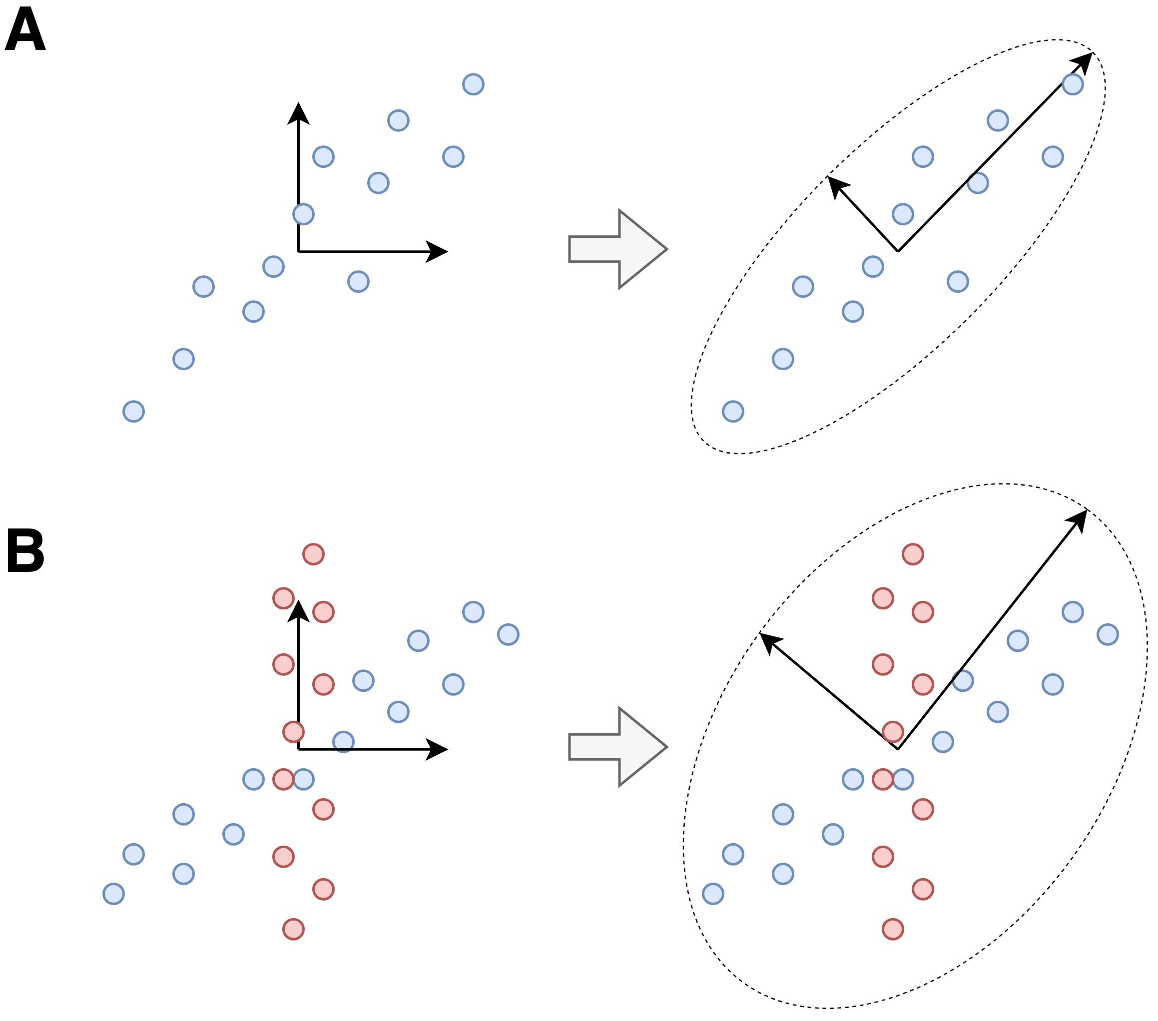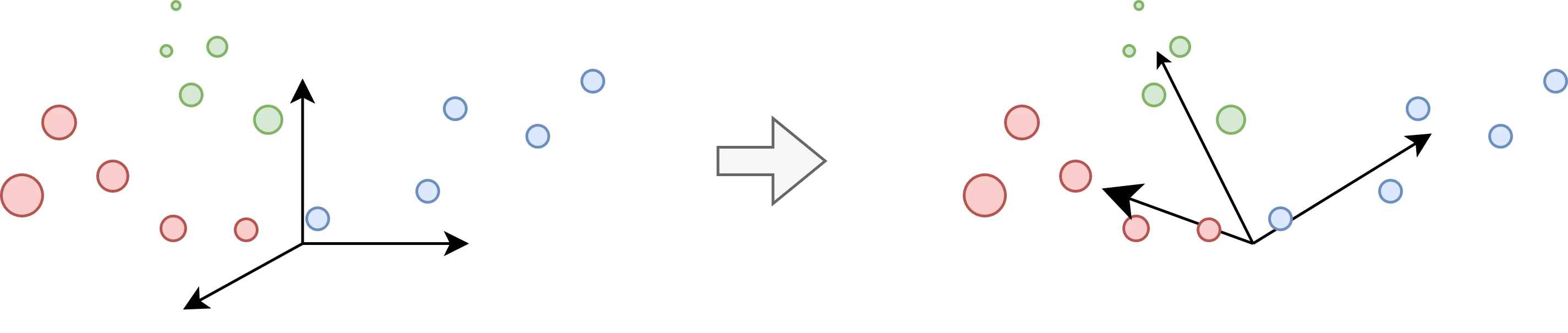 Unsurprisingly, many matrix factorizations have been proposed. A well-known one is the principal component analysis, or PCA. Geometrically speaking, PCA fits an ellipsoid to the data, and uses the axes of this ellipsoid as the basis for the new space. This is equivalent to PCA’s well-known interpretation: capturing the main axes of variation in the data. However, when our data has substructures that are not captured by the variance, PCA performs pretty poorly.