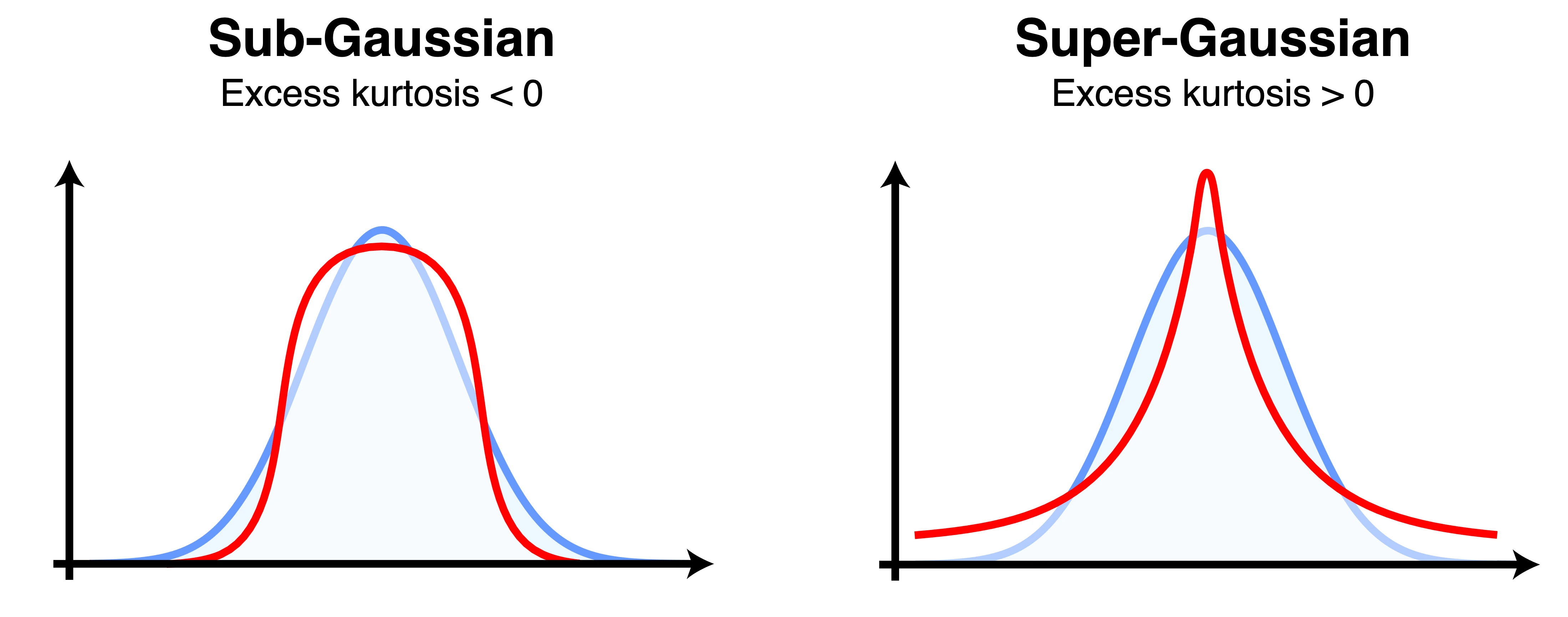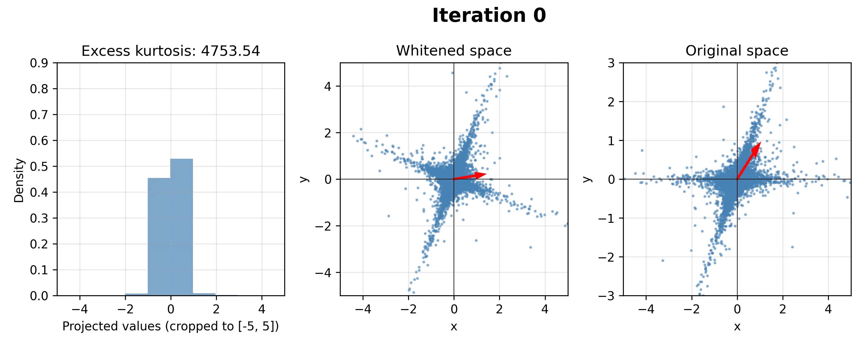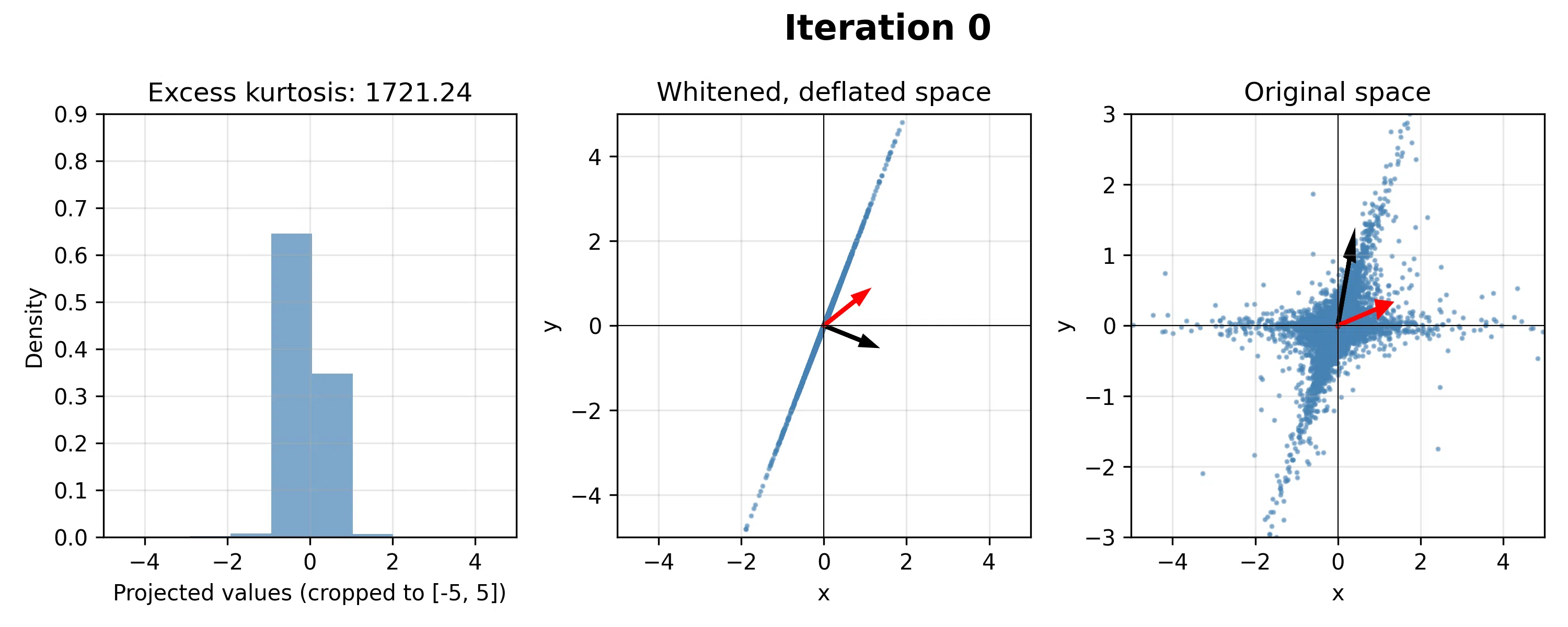 \[\operatorname{Kurtosis}(Y) = E\left[\left(\frac{Y - \mu}{\sigma}\right)^4\right] - 3.\]Since our data is centered and whitened, this simplifies to \(\operatorname{Kurtosis}(Y) = E\left[\left(Y\right)^4\right] - 3\).