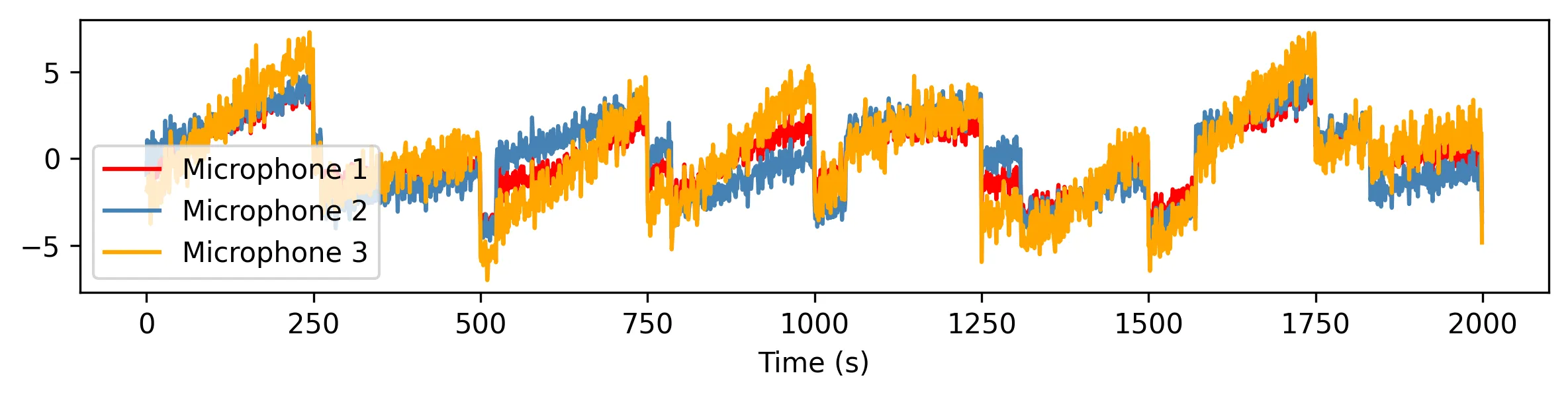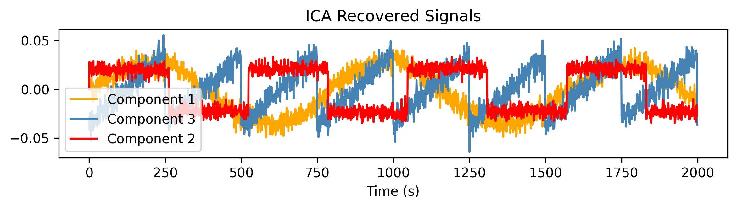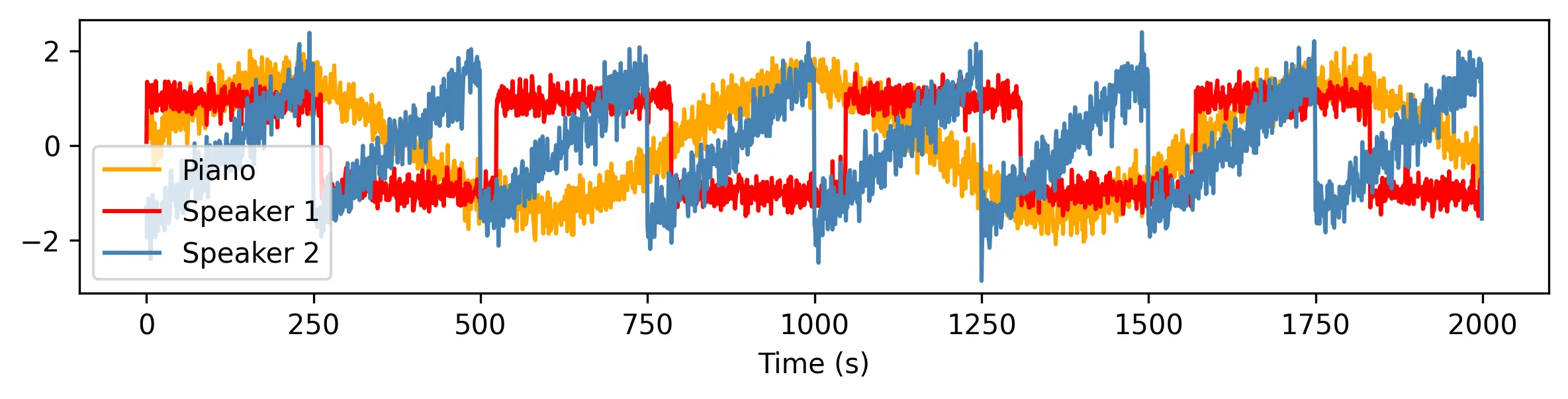 More formally, ICA assumes the observed data is a mixture of the individual components. For instance, in the cocktail party, each component (e.g., the piano playing) is a vector indexed by time (\(s_j(t)\)). The components must meet two assumptions: non-Gaussianity and statistical independence. There is also an assumption that they are combined linearly to generate the observed data: