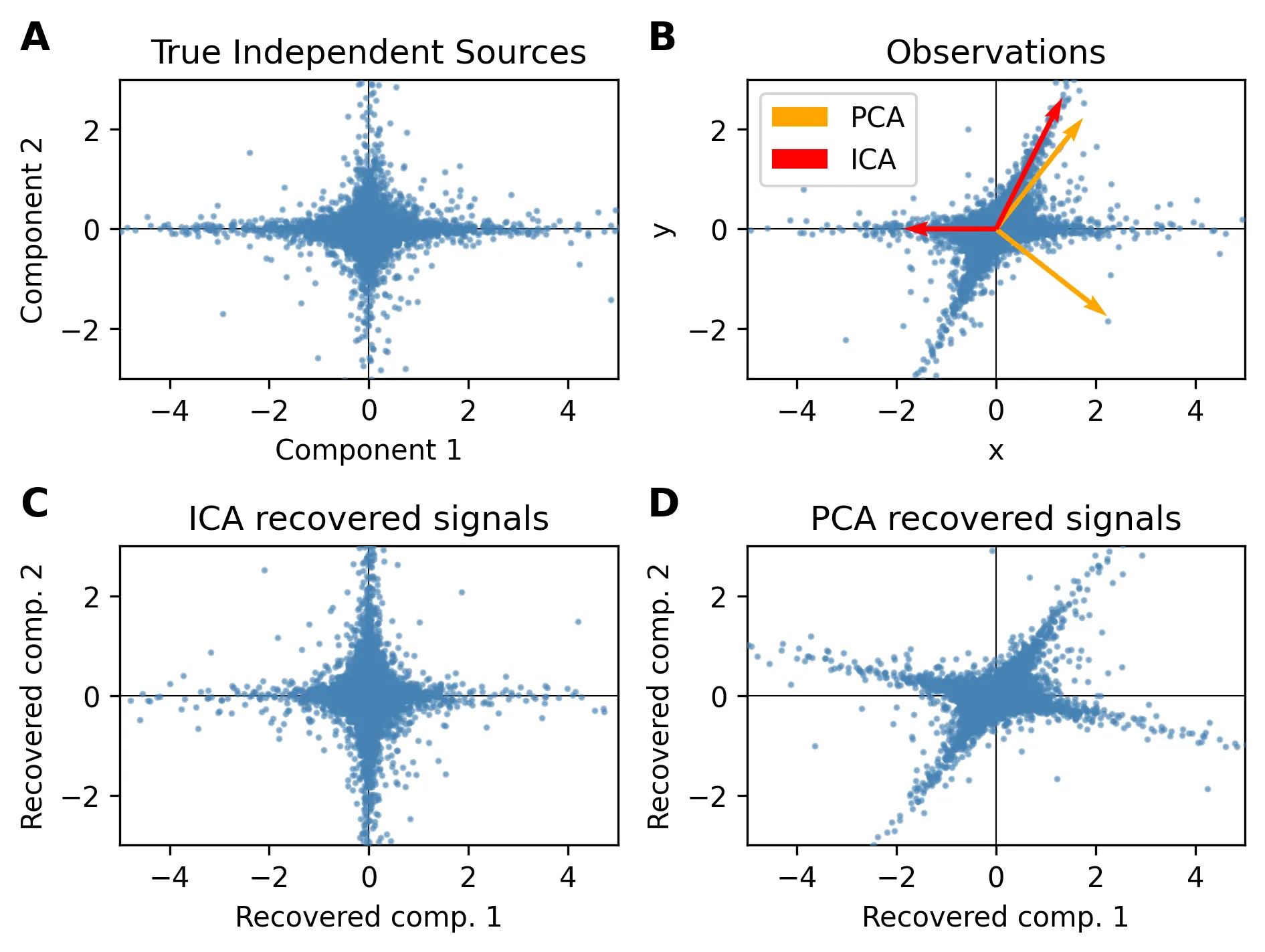 \[X = AS\]where \(A\) is called the mixing matrix and \(S\) the independent component matrix. The goal is to estimate both \(A\) and \(S\) from \(X\). To that end, ICA seeks a de-mixing matrix \(W\) such that: