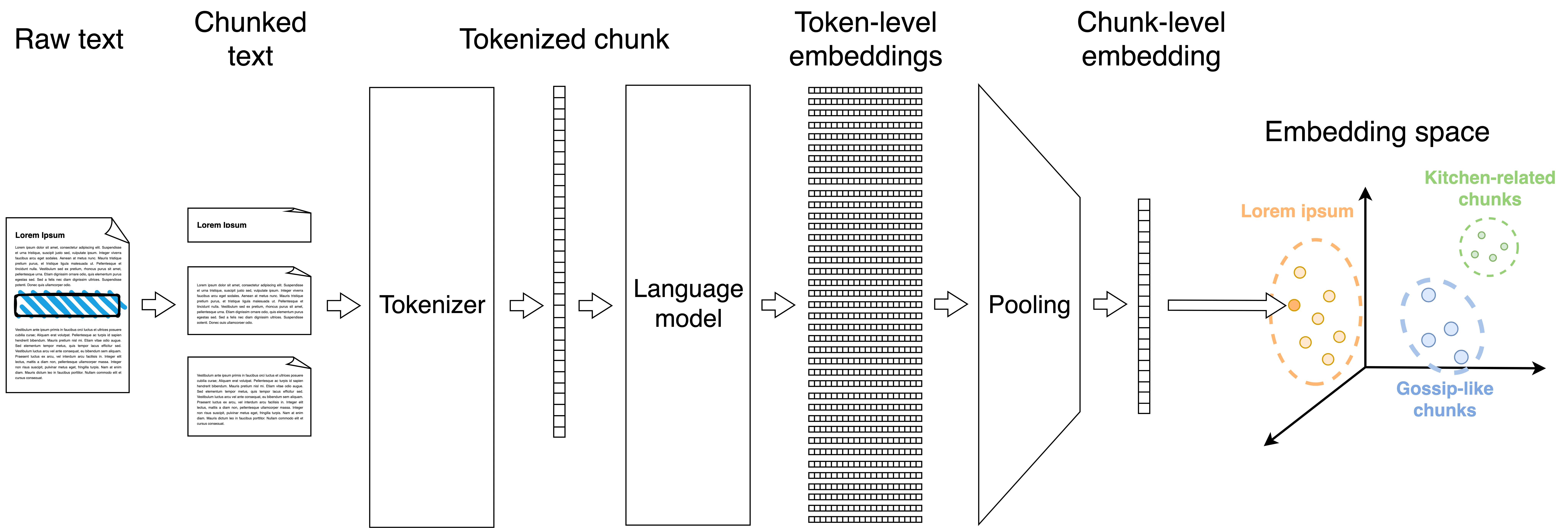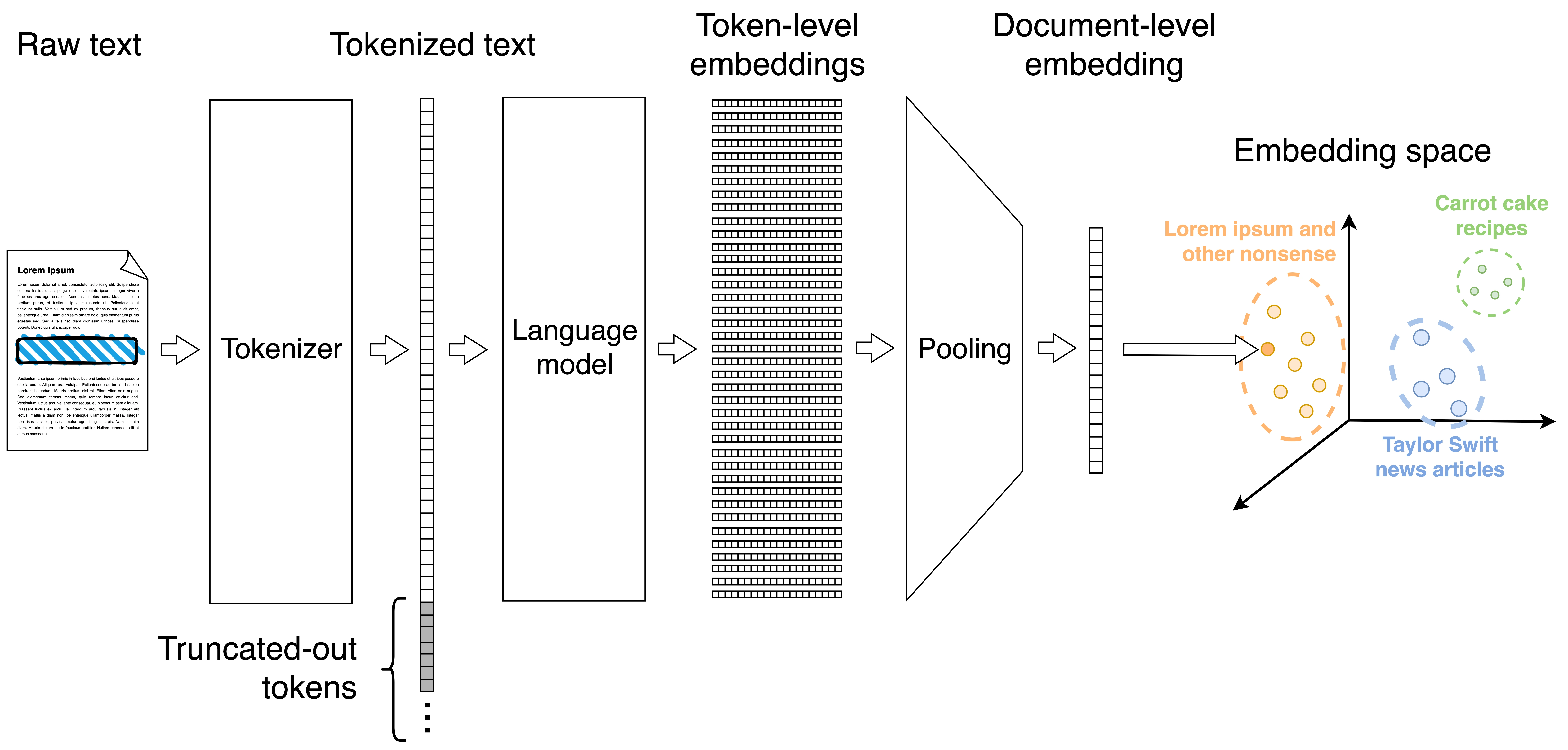 However, I just glossed over a very important detail: embedding a whole document is a bad idea. We can think of an embedding as lossy compression; and, since the dimensionality is fixed, cramming more content means losing more information. Not too unlike stuffing a novel into a tweet. That’s why many popular embedders are trained on sentences and short paragraphs, not on long texts. In fact, all-MiniLM-L6-v2