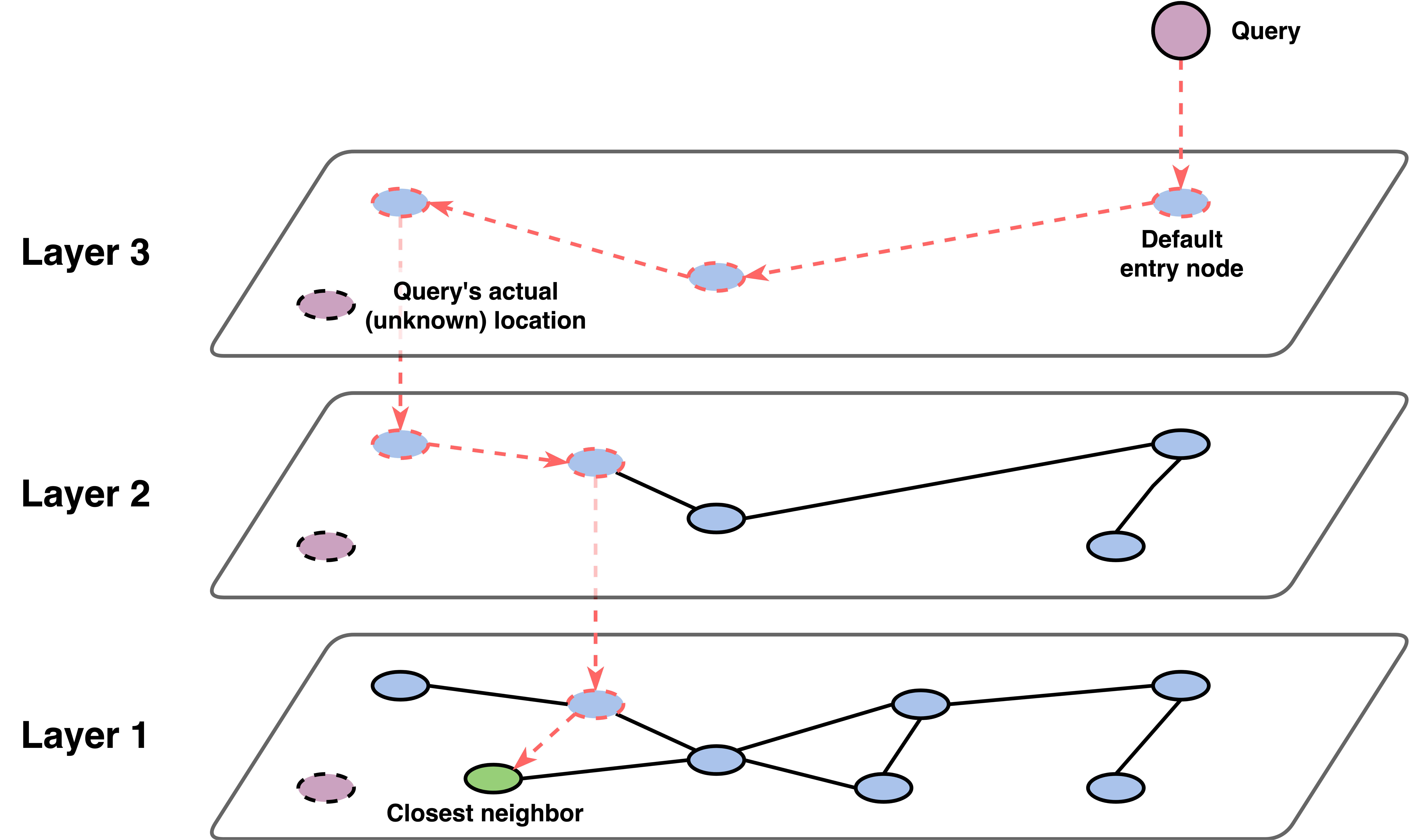 This multi-scale approach allows HNSW to quickly “zoom in” on the right region of the space. The upper layers provide coarse navigation (like highways), while the bottom layer provides fine-grained search (like local streets).